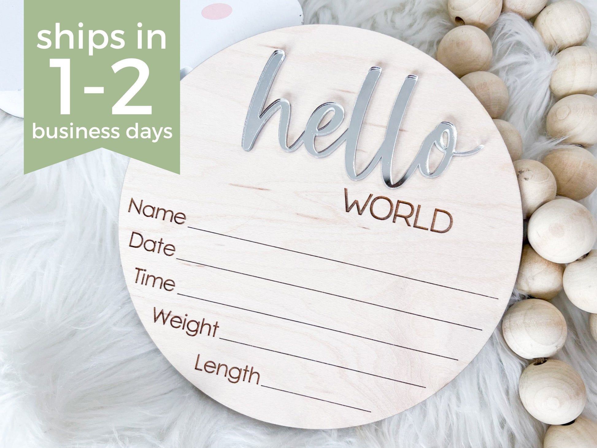 3D Acrylic "Hello": The word "hello" is cut from high-quality acrylic and layered in 3D on top of the wood round, adding a subtle shadow and modern texture.