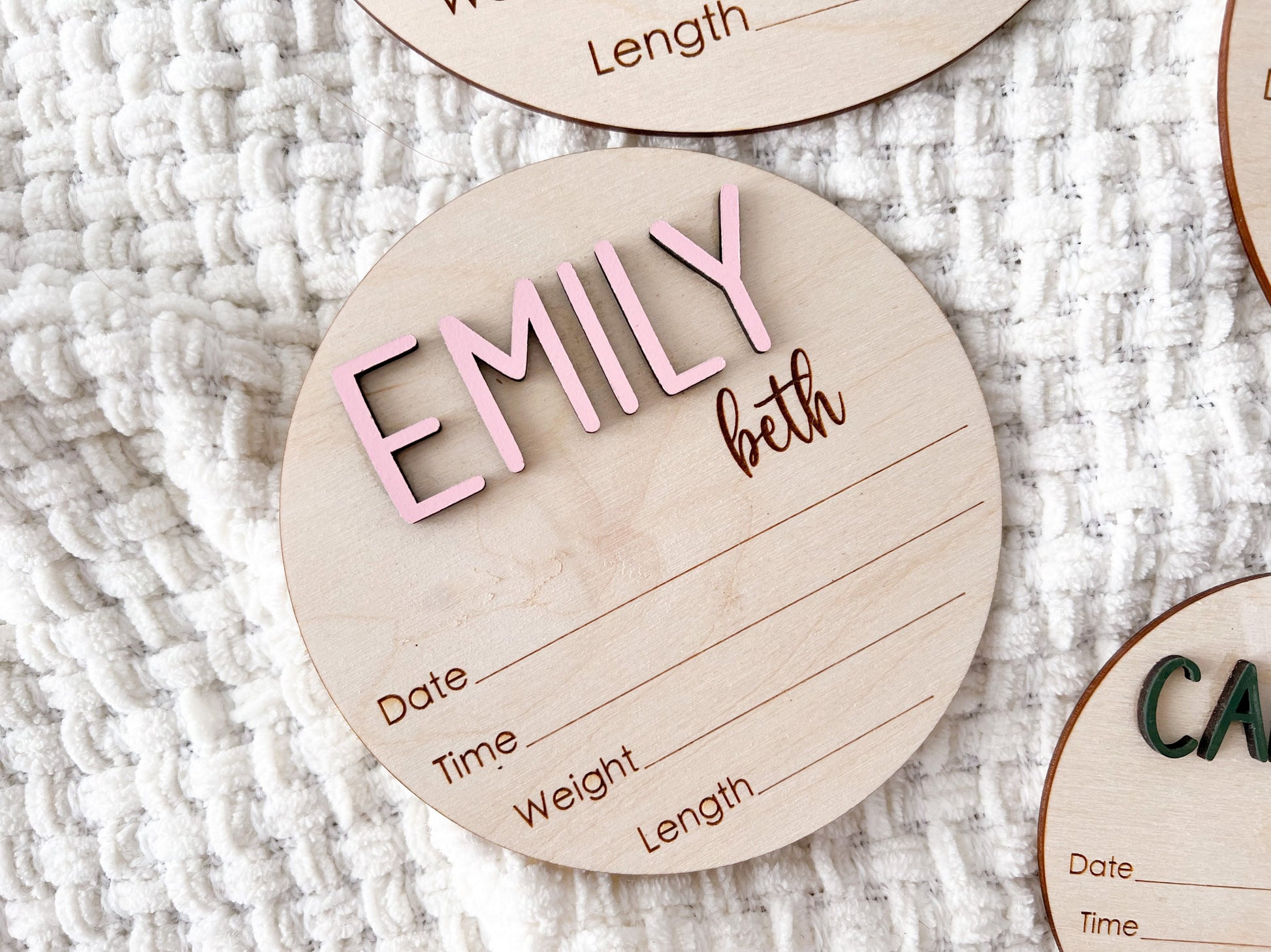 This sign has a 3D first name and engraved middle name and stats. Perfect for birth announcement and photo prop